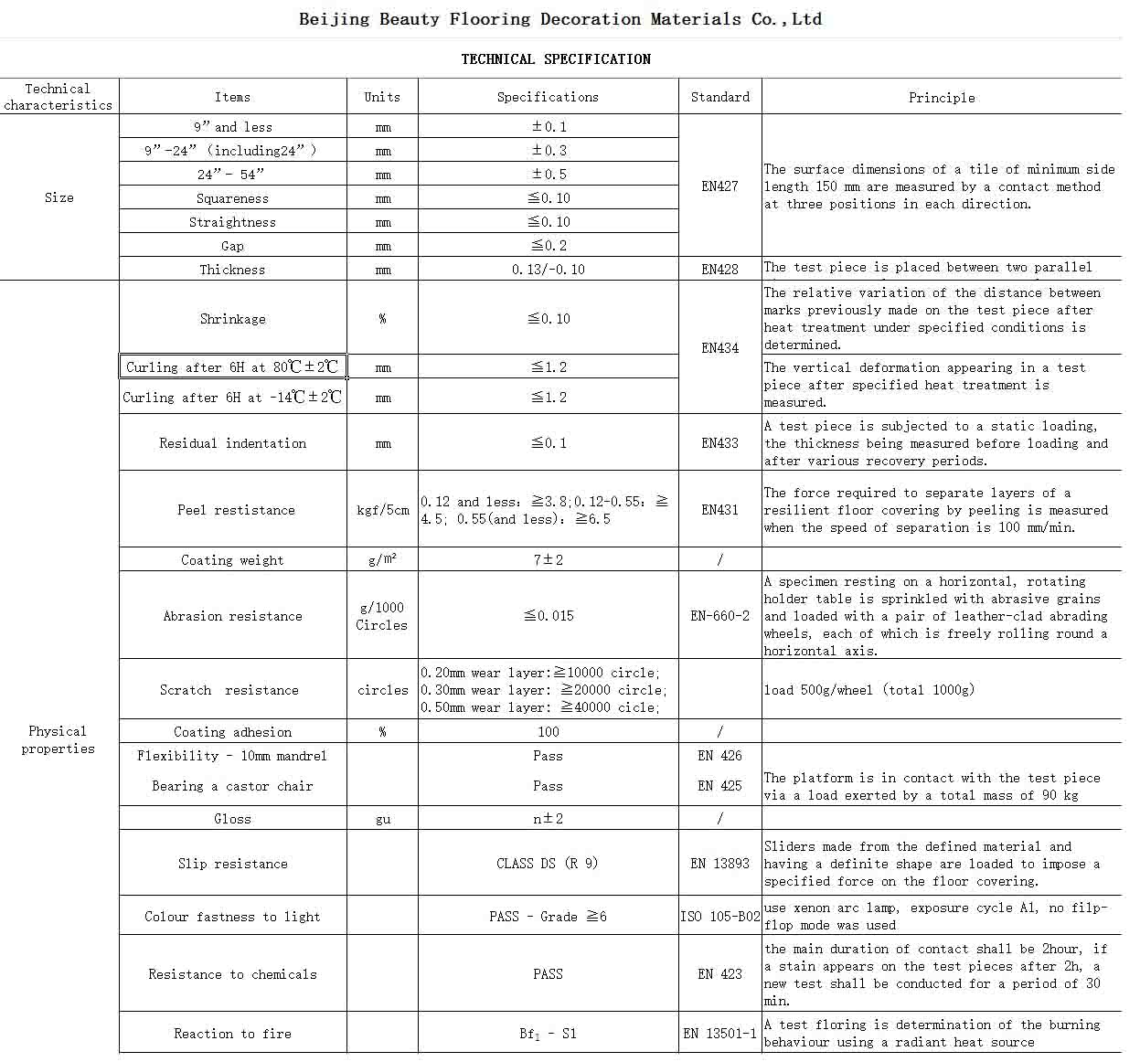 Techincal information of vinyl flooring (made by BEAUTY FLOORING)